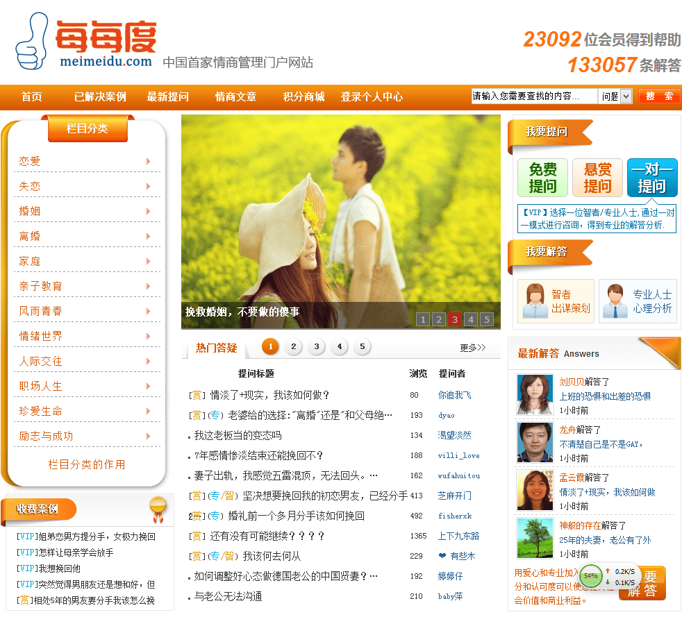 每每度:中国首个情商管理网站-第1张图片-王尘宇 每每度是由海外归国人士和国内心理专业人士于2011年2月创办的心理互助社区,致力于打造一个由专业心理咨询师和民间智者为广大网友提供心理咨询服务的网络平台。聚焦中国民众所关注的心理话题,充分发挥网络心理咨询平台的优势,为关注心灵成长的人群提供"分享智慧,助人自助"的心灵家园。 每每度的宗旨——每个人,每一天,在这里都能度过心灵的困境。每每度本着分享智慧、助人自助、细致入微的原则,为每一个有心理烦恼的人提供专业、智慧和及时的帮助,充实生活的快乐;为每一个充满爱心的智者和专业人士提供完善的助人平台,奉献爱心和智慧。 每每度:中国首个情商管理网站-第2张图片-王尘宇 每每度定位为"最全面的心理烦恼解决社区,最贴心的网络心理咨询平台"。 最全面的心理烦恼解决社区 每每度通过对一线心理咨询师的咨询工作和广大网友常见的心理烦恼的调查,搜集整理了涉及婚恋情感、亲子教育、成长烦恼、职场人际、情绪管理等领域的十六个一级栏目和三百多个二级栏目。让每一个有心理困惑的人都能找到心灵的归属,在获得帮助的同时,也可以为有相似烦恼的人分享自己的成长经验和智慧,达到助人自助,滚雪球似的问题解决模式。 最贴心的网络心理咨询平台 每每度拥有一支专业的技术开发团队,开发了每每度心理咨询和心理讲座的视频平台,供民间智者和心理咨询师进行咨询工作,通过前期的测试,功能和界面在用户体验上都得到了咨询师和来访者的认可。 最贴近大众的助人模式 每每度的助人团队不仅包括国内广大专业心理咨询师,还包括有丰富解决烦恼经验的民间智者,在体现助人专业性的同时,也注重贴近生活、符合民众的助人方式。只要你有爱心,想分享自己的智慧和经验,那么每每度将为你提供最舒适的助人平台。 每每度根据社会关注焦点和每个人成长中的普遍心理烦恼,着力打造: 在线社区——网友针对个人烦恼提问,智者、专业人士及时回复解决; 精彩文章——智者、专业人士分享智慧和经验; 视频咨询——最及时的咨询师针对网友的心理咨询服务; 视频讲座——最焦点的心理困惑讲座,分享和讨论烦恼与解决之道。 每每度致力于打造最贴心、最及时、最全方位的心理咨询服务平台。